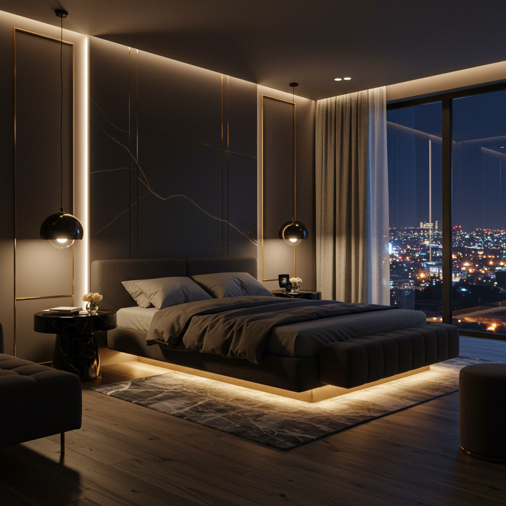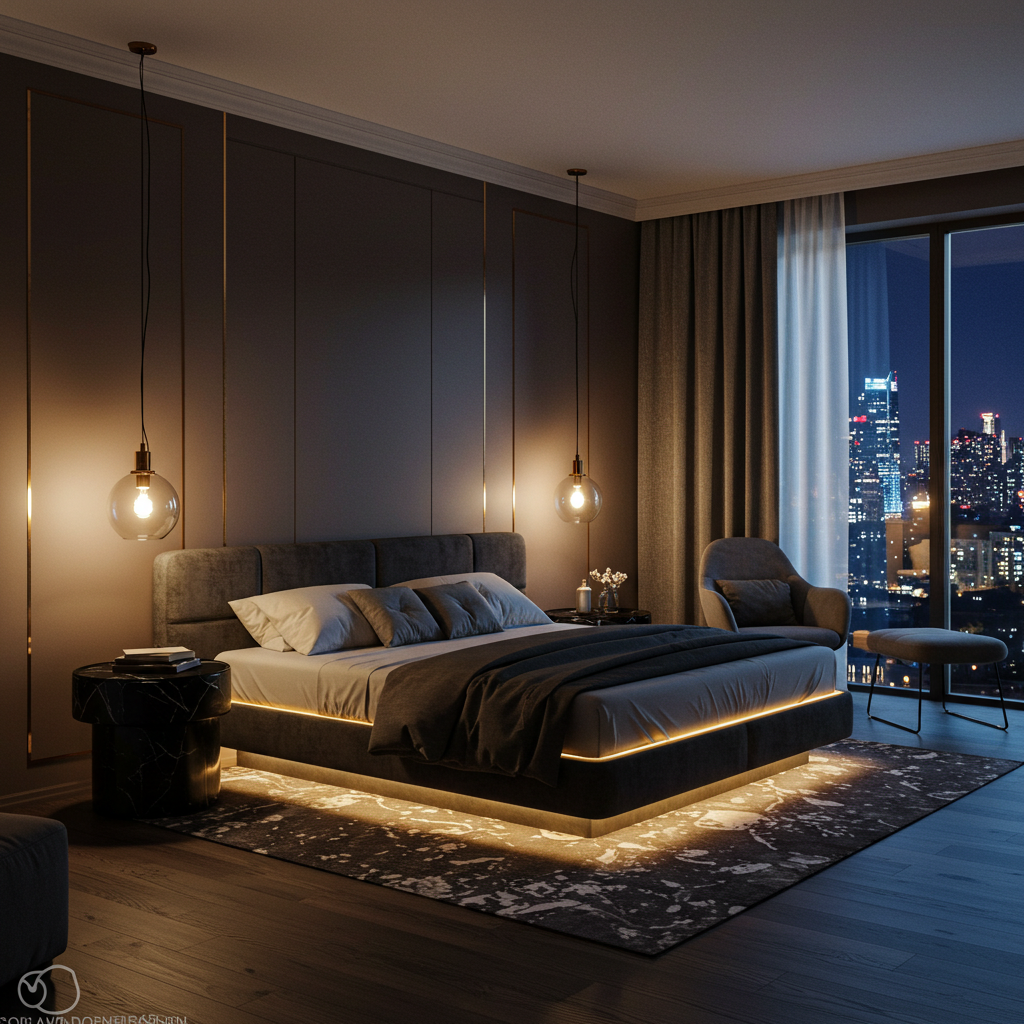 Göz alıcı bir şehir manzarasına sahip, modern ve lüks yatak odası. Siyah mermer duvar, gizli LED aydınlatmalı “yüzen” yatak ve zarif sarkıt lambalarla loş, dinlendirici ve oldukça şık bir atmosfer yaratılmış. 🌃✨