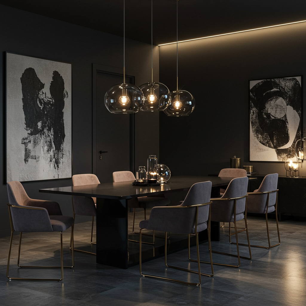 Küresel Aydınlatma Sanatı: Masanın üzerine asimetrik sarkan füme cam küre aydınlatmalar, ortamın dramatik havasını yumuşatırken odak noktasını yemek alanına topluyor. 💡🔮