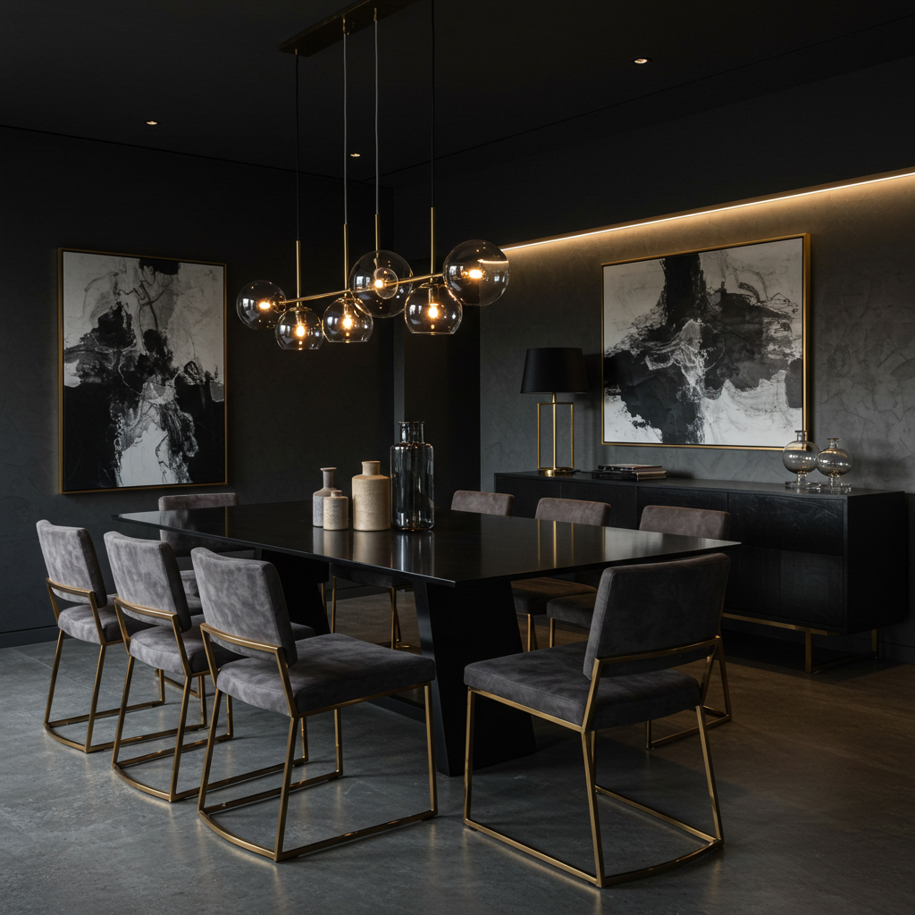 Monolitik Masa Tasarımı: Mat siyah ahşap dokulu geniş yemek masası, güçlü ve sarsılmaz duruşuyla odanın otoriter merkezini oluşturuyor. 🧱🖤