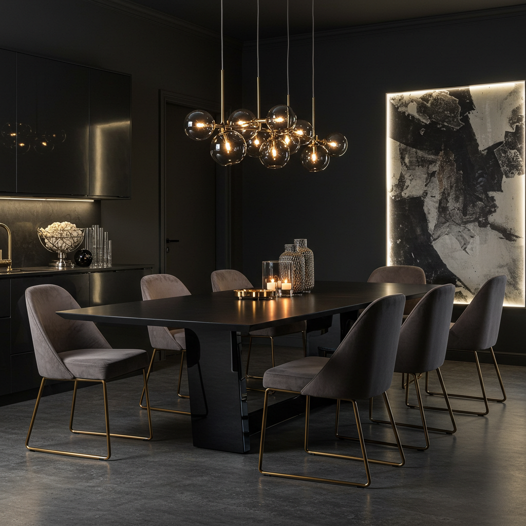 Ziyafetin En Sofistike Hali! 🍷 Mat siyahın asaleti, gold detaylı kadife sandalyeler ve büyüleyici küre aydınlatmalarla buluştu. Noir Banquet, modern hatları ve dramatik ışık oyunlarıyla yemek odanızı şehrin en seçkin mekanına dönüştürüyor. 🖤✨🛋️