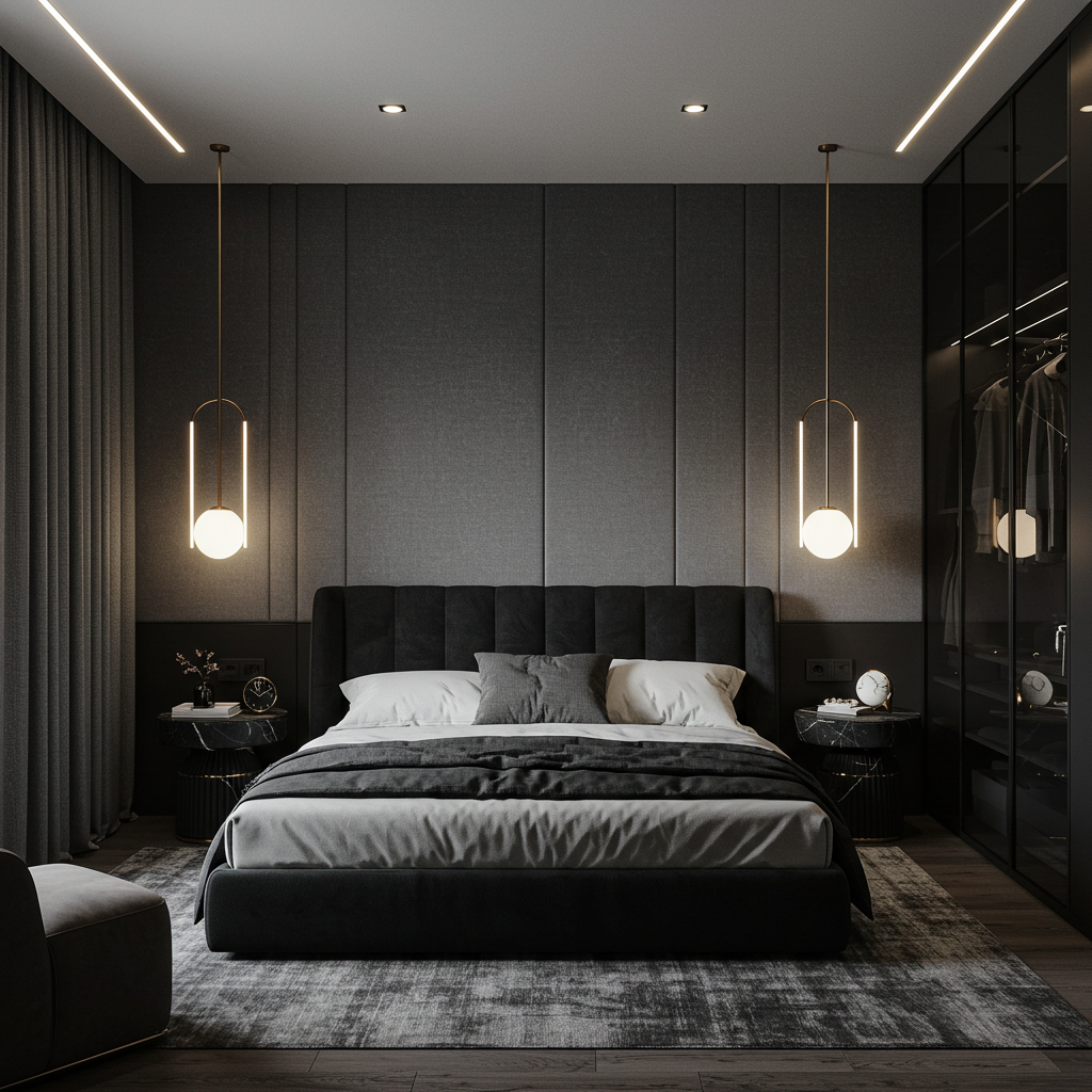 Aydınlatma Sanatı: Oval formdaki gold detaylı sarkıt lambalar, odanın sert ve net çizgilerini yumuşak bir ışıkla dengeleyerek mükemmel bir ambiyans sağlıyor.